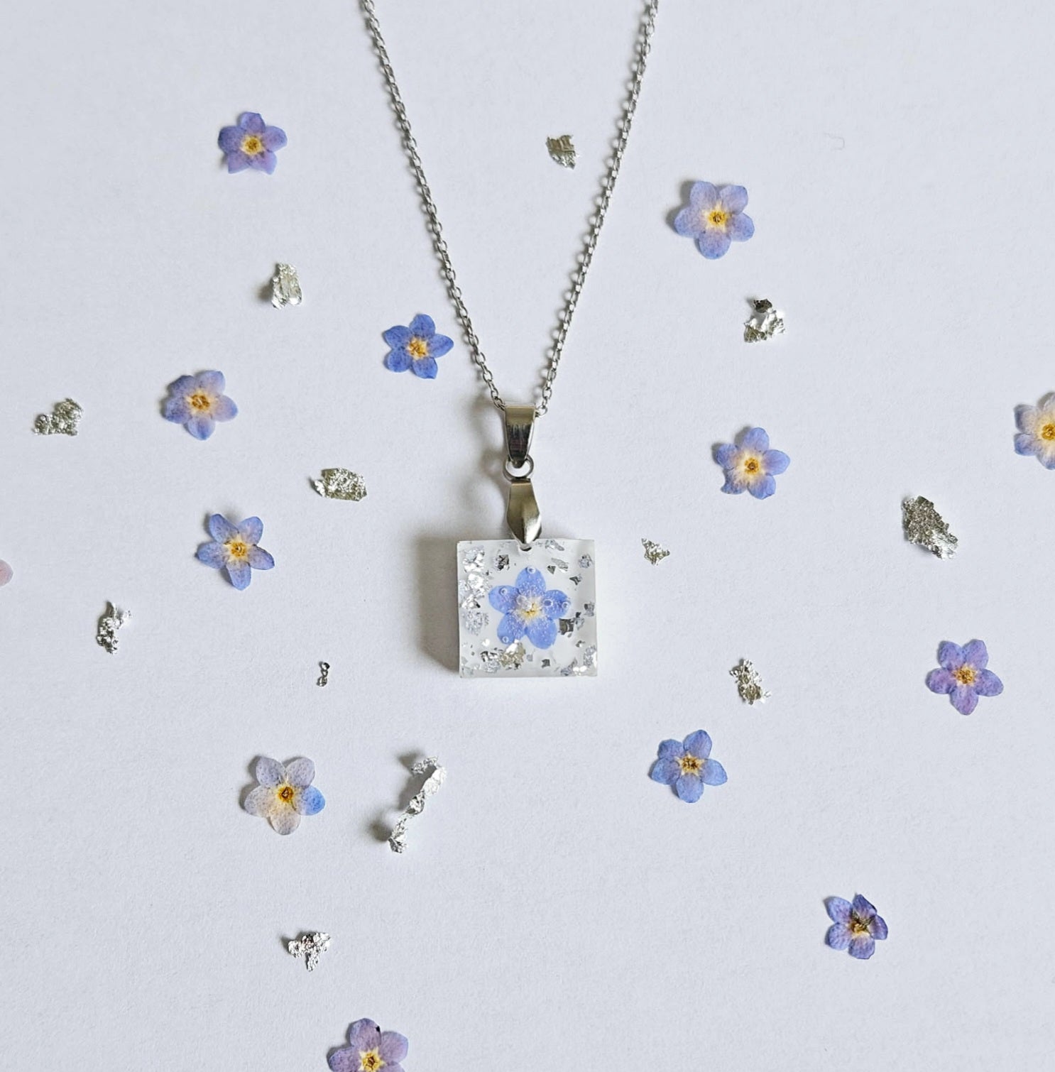Ce collier floral est une pièce unique en résine, avec une magnifique fleur bleue en son centre.